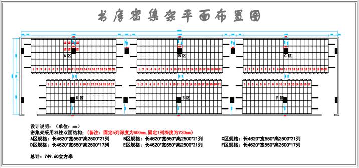 根據(jù)客戶前期提出的幾個(gè)要求,我司設(shè)計(jì)部與客戶溝通好后,根據(jù)書(shū)庫(kù)房間結(jié)構(gòu)結(jié)合客戶的需求設(shè)計(jì)了118列密集架,因房間柱子較多分6個(gè)團(tuán)體。