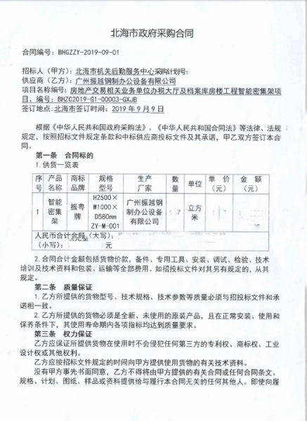 因此想采購一批智能密集架、想詢找廣西或廣東生產(chǎn)密集架的廠家, 并有智能電動密集架資質(zhì)的公司2019年8月份進行公共投標,通過激烈的競標甄選,最終篩選了我們公司,廣州振越公司生產(chǎn)的智能檔案密集架。